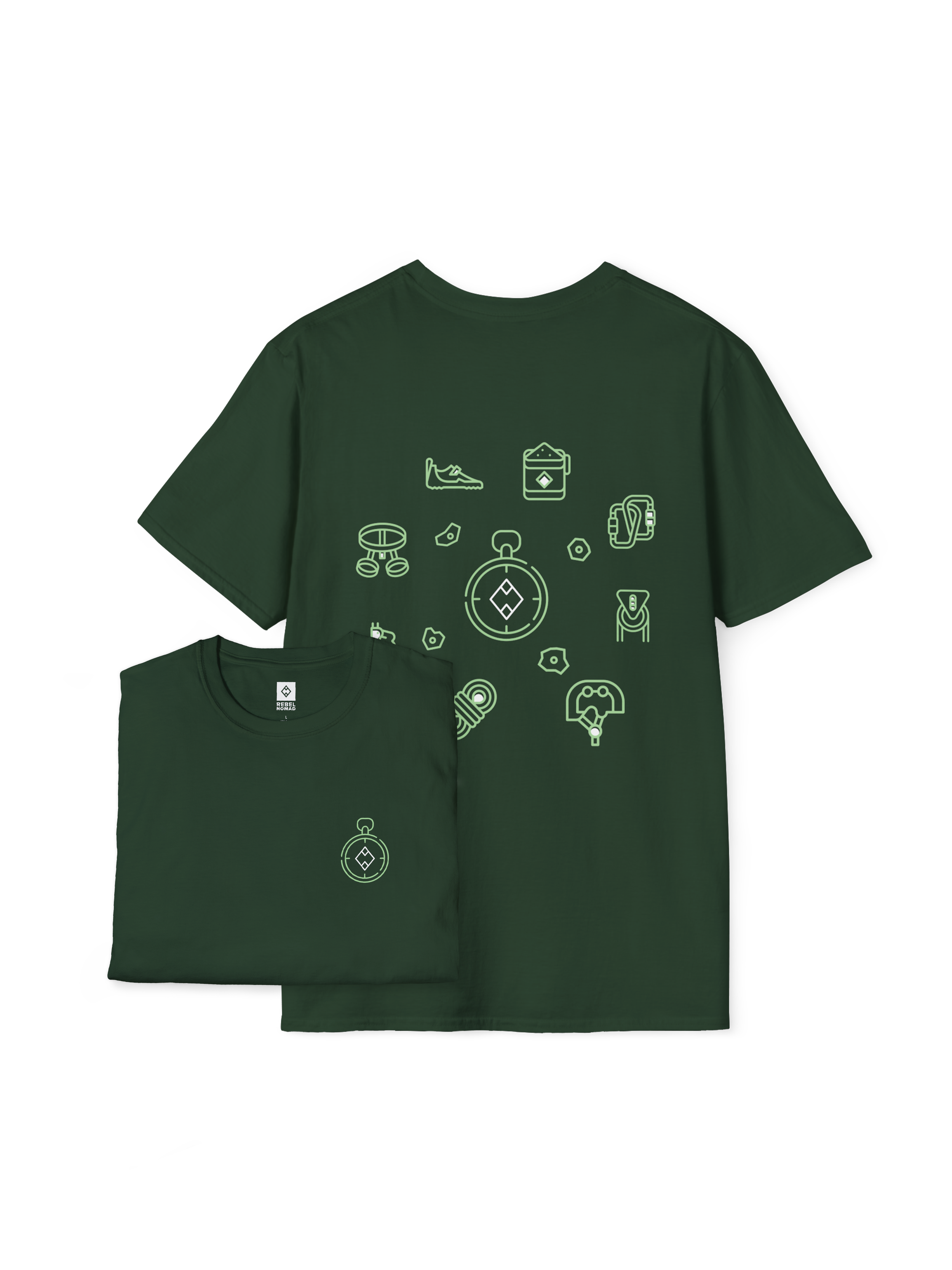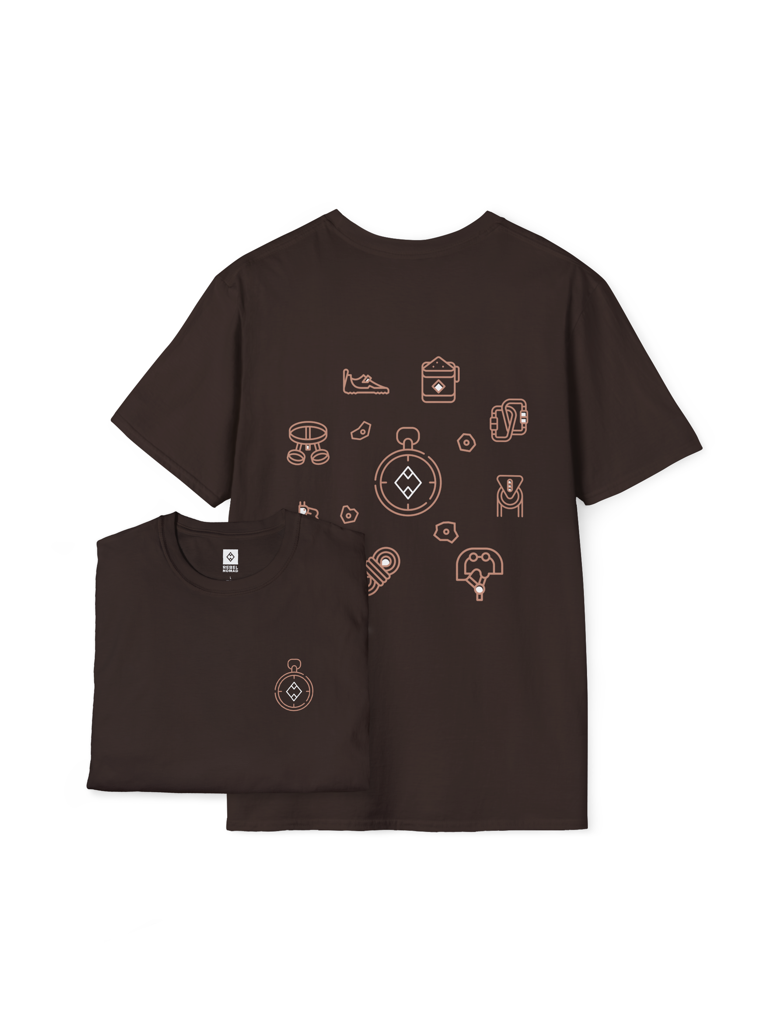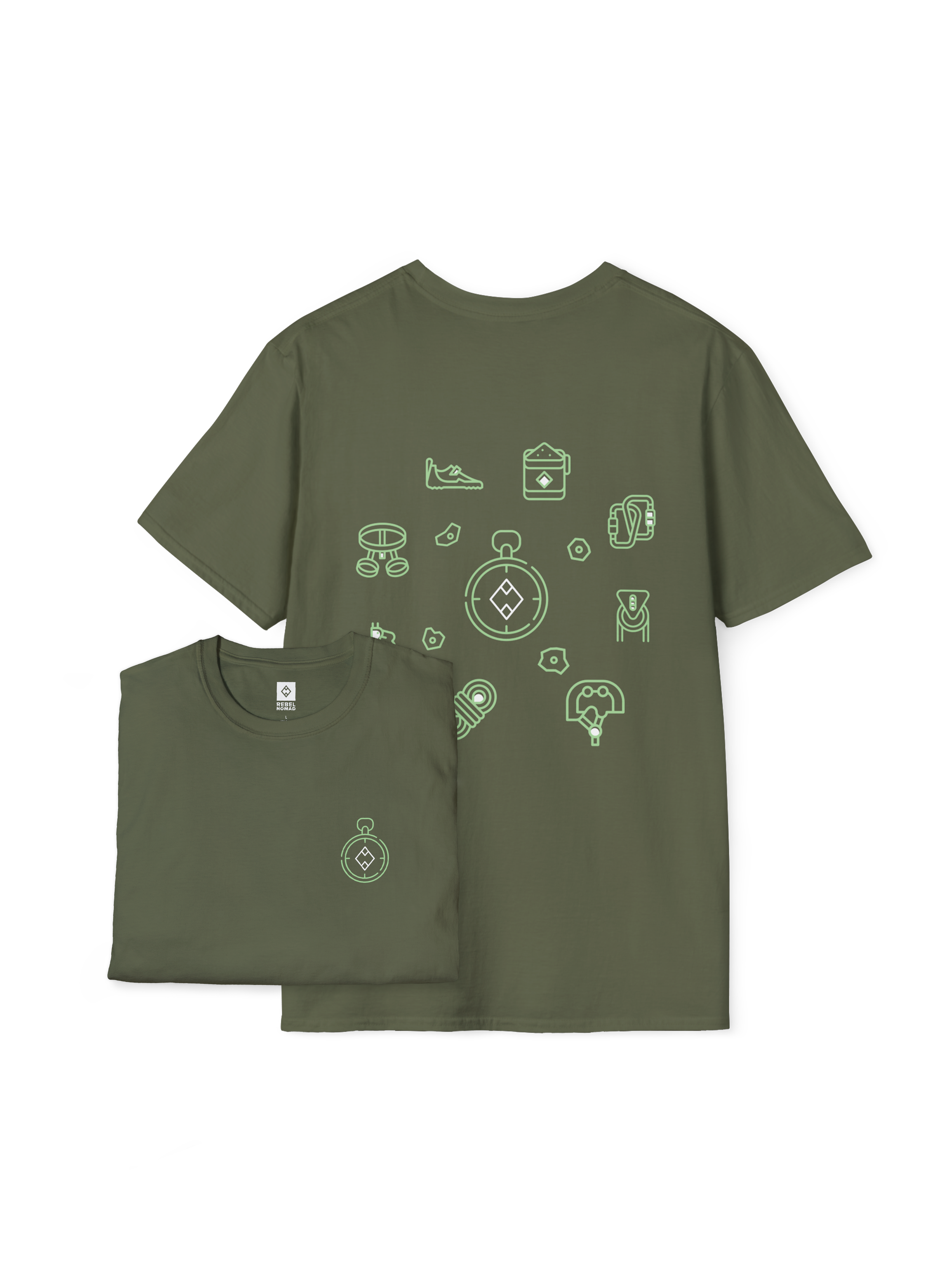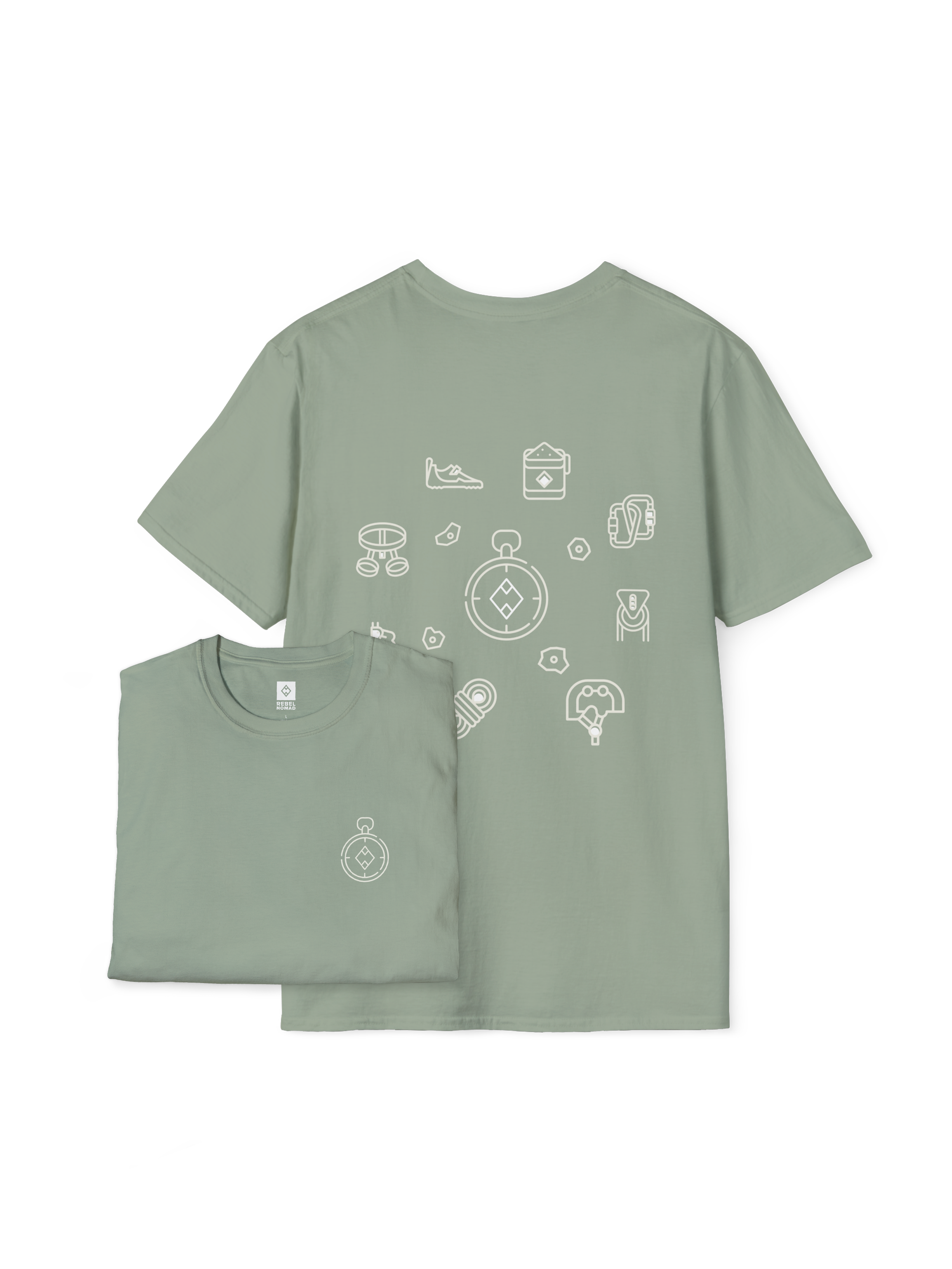 For those who seek vertical freedom. The Ascent Essentials Tee is a blueprint for the climb, featuring a collection of gear—from carabiners to cams—all guided by our iconic compass emblem. This tee is a tribute to the commitment, focus, and essentials required to defy gravity. It's more than fabric; it’s a wearable checklist for your next big wall. Gear up, trust your knot, and find your line.