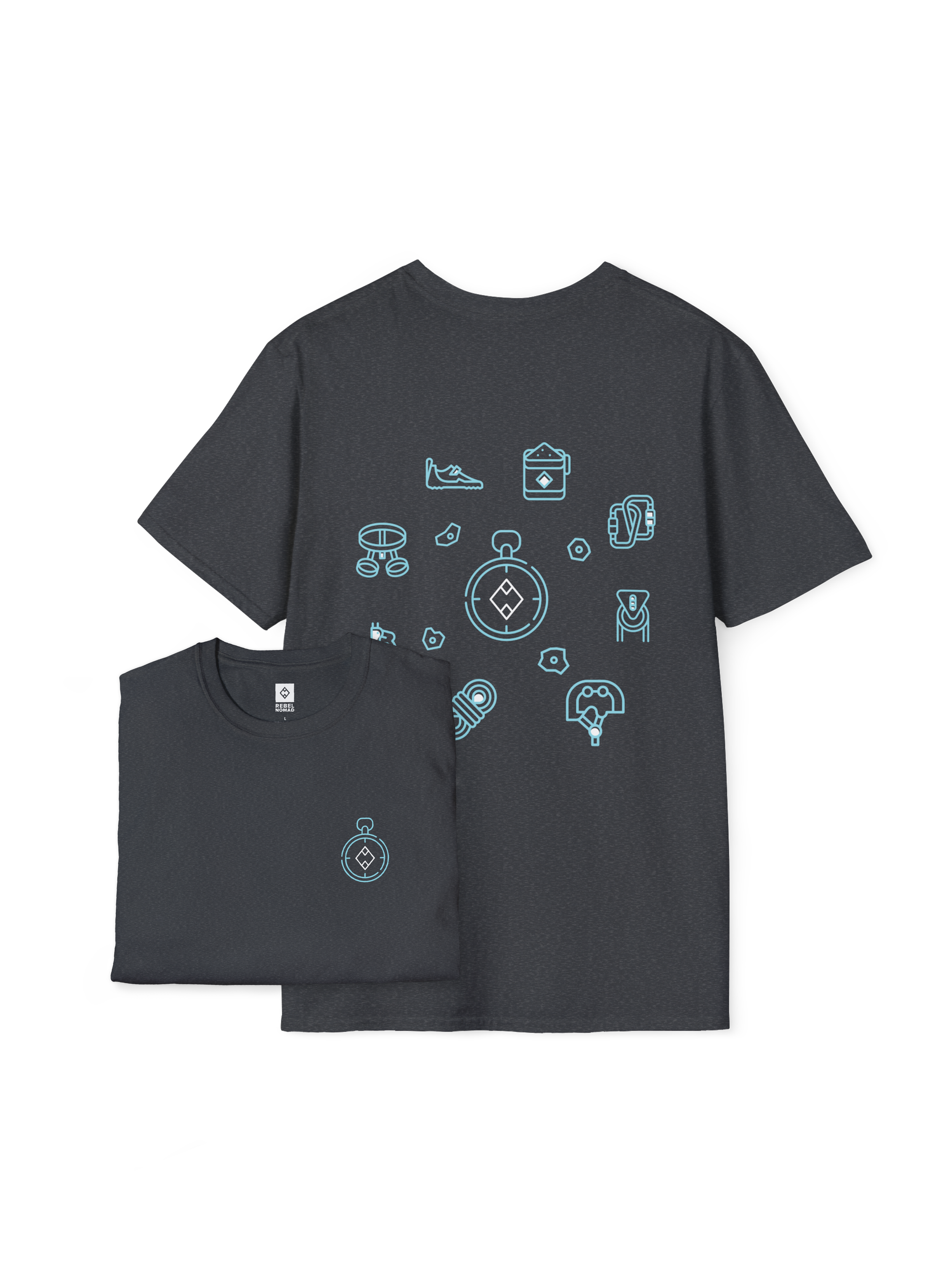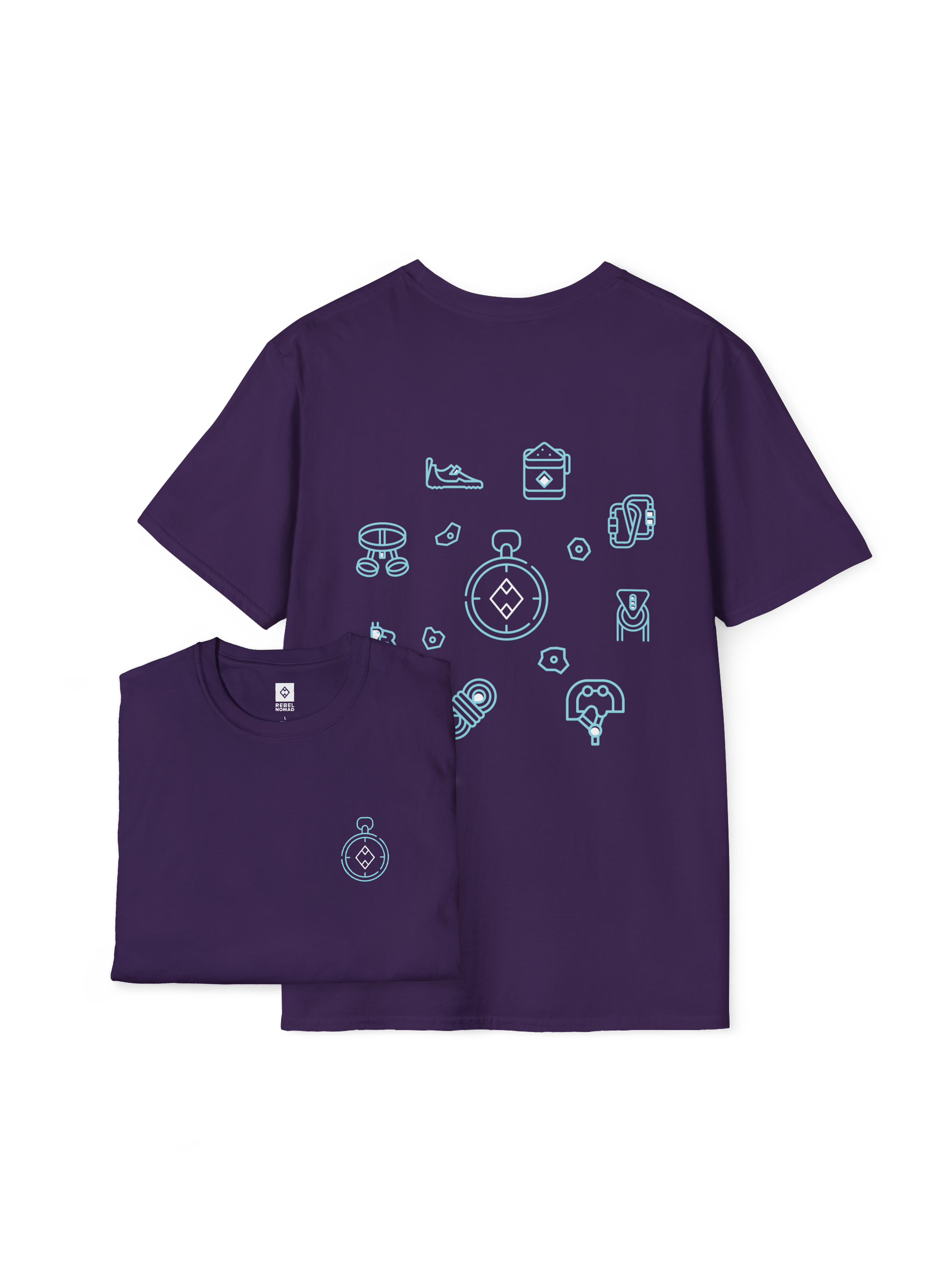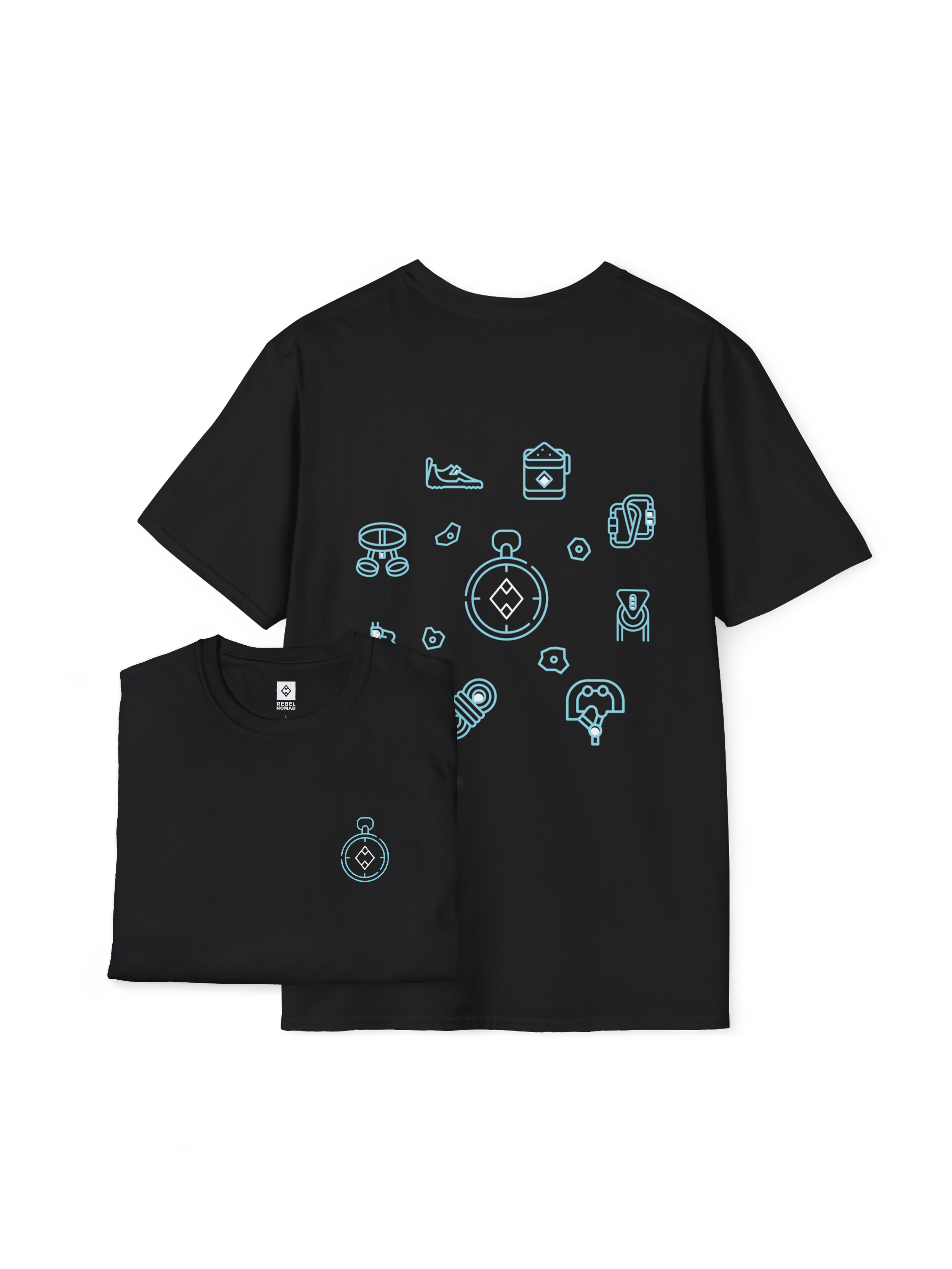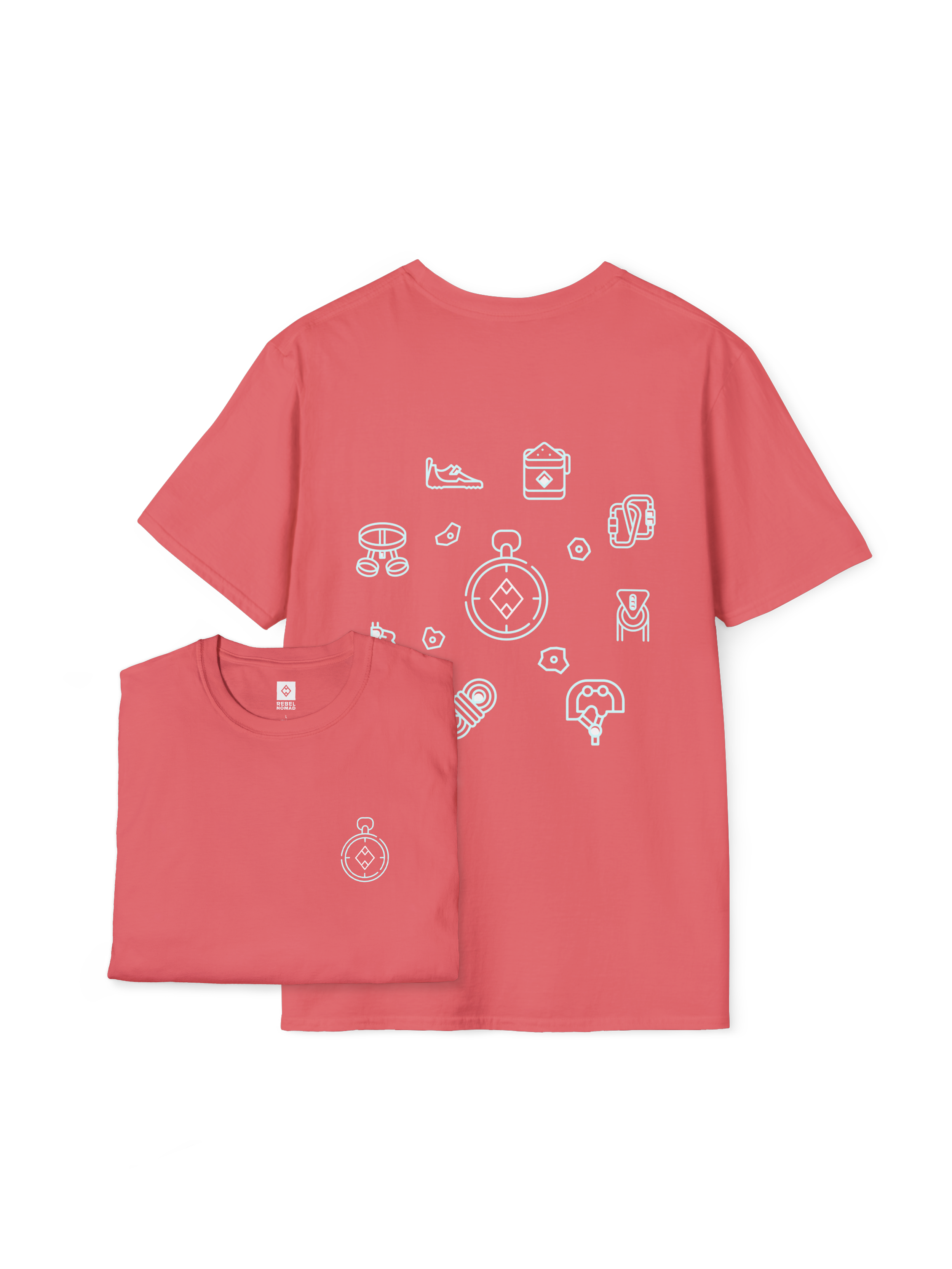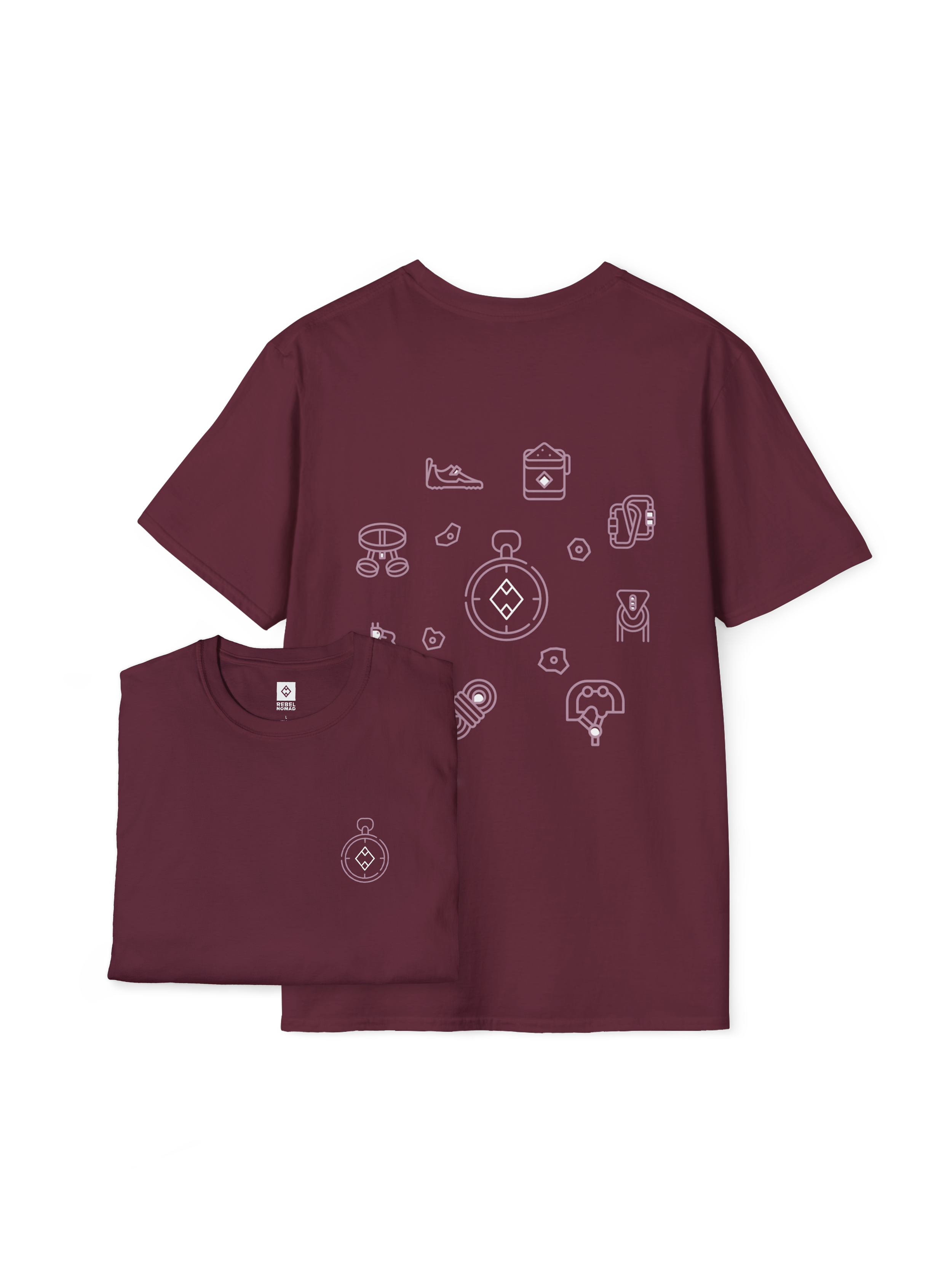 For those who seek vertical freedom. The Ascent Essentials Tee is a blueprint for the climb, featuring a collection of gear—from carabiners to cams—all guided by our iconic compass emblem. This tee is a tribute to the commitment, focus, and essentials required to defy gravity. It's more than fabric; it’s a wearable checklist for your next big wall. Gear up, trust your knot, and find your line.